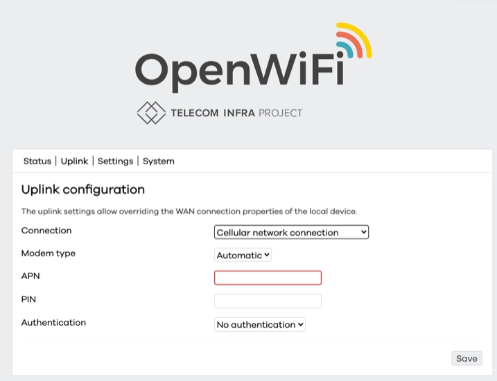 If the OpenWiFi device has a Cellular connection which is possible on device models with 4G and 5G radios, the network Access Point Name (APN) and PIN will be required. These values are supplied by your mobile network provider.