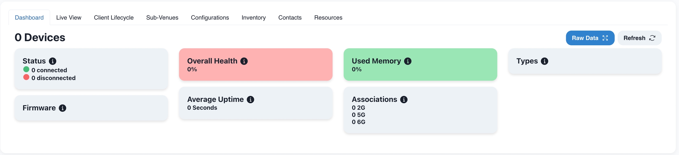 When Analytics are enabled, the Dashboard is populated. As devices are associated to the Venue, their telemetry data is aggregated by Analytics service and correlated for display via Dashboard, Live View and Client Lifecycle.