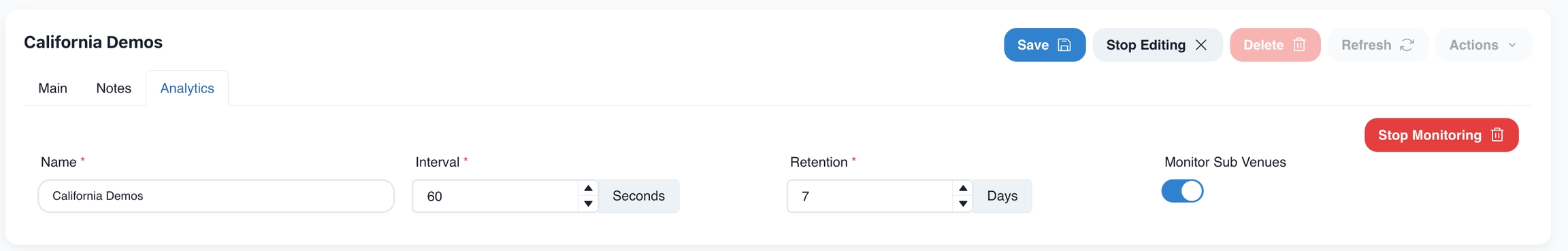 Choose Edit and Start Monitoring. This will enable the admin to determine the interval of analytic data aggregation, and the data retention window in days.
