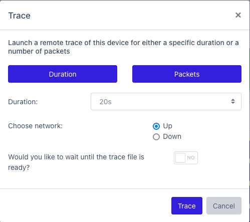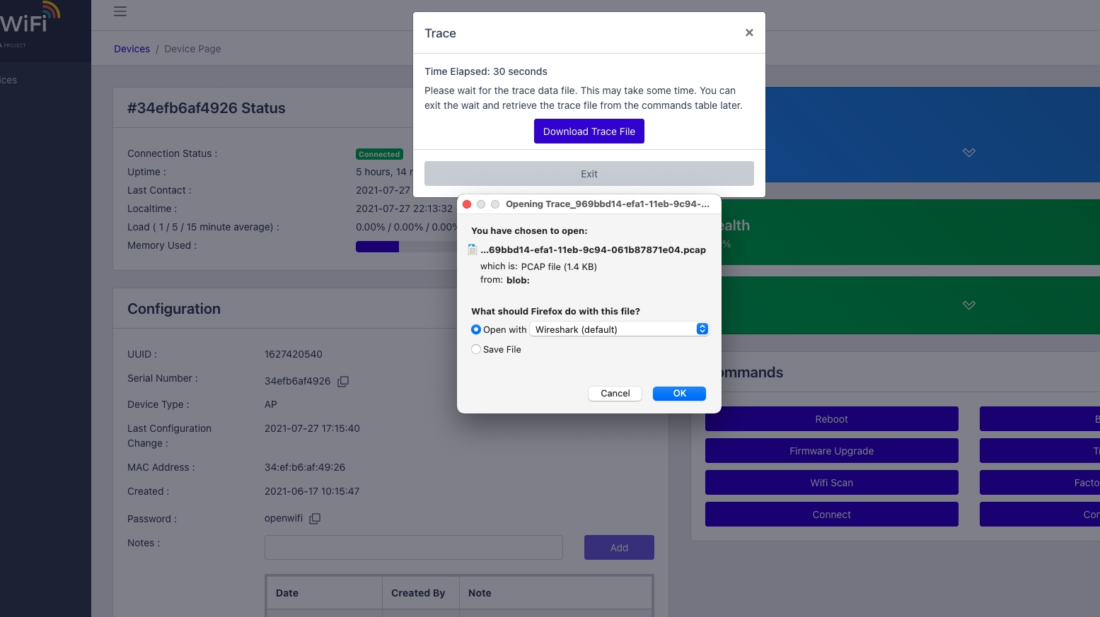 Trace feature enables a remote packet capture to occur on the managed device, over a specified period of time or amount of traffic, returning the "pcap" packet capture file locally to the OpenWiFi admin user.