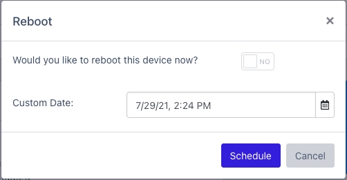 Selecting the Reboot action will prompt the below dialog. Options presented permit an immediate reboot or a scheduled reboot based on date and time.