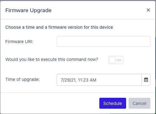 Multiple methods exist to execute a remote Firmware Upgrade of a device. When selecting Firmware Upgrade via the Commands tile, a simple dialog to upgrade immediately or at a scheduled time is presented. Alternatively using the Firmware Management Service provides a complete solution including managed access to all TIP firmware images.