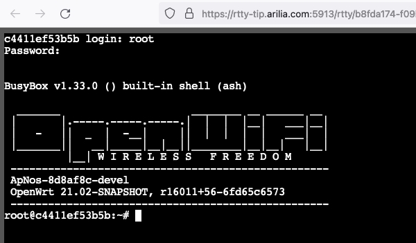 OpenWiFi enables remote connection to any managed device using rTTY encrypted shell session. Selecting Connect will cause a browser tab to open with the login session to current device.