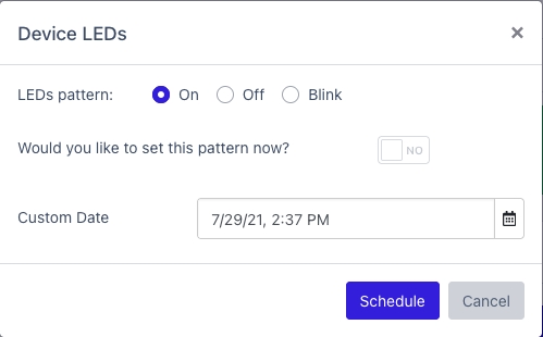 To assist with remote identification of devices in the network, it is possible to turn the LED lights On, Off, of continuous blinking. This may be run on-demand or scheduled.
