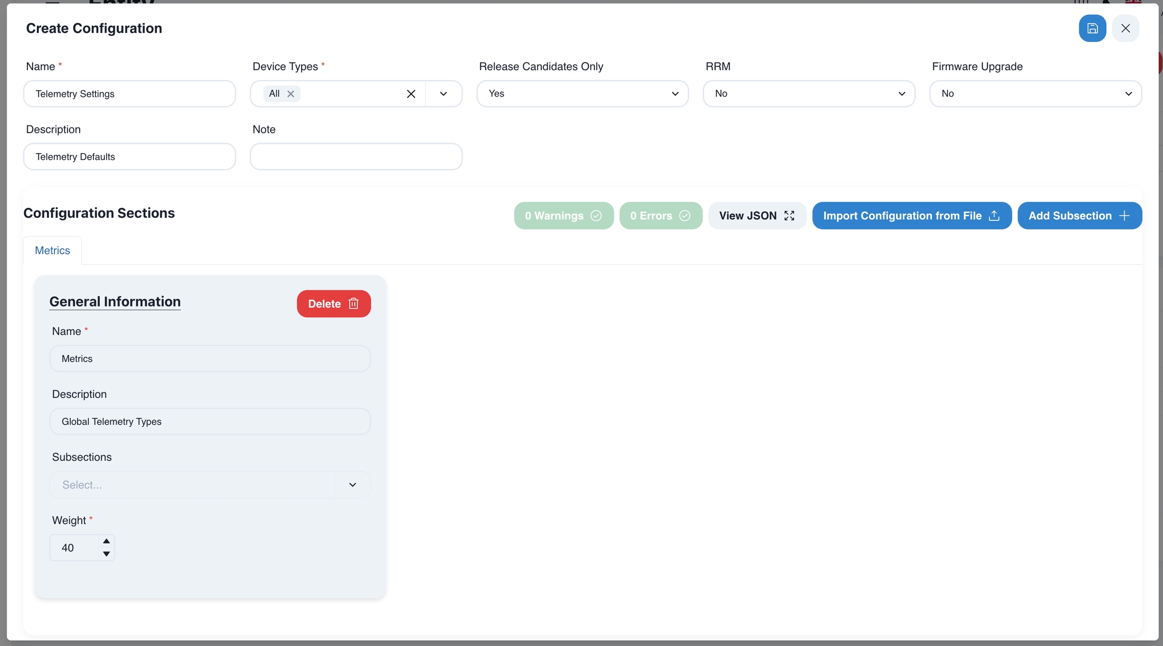 Within the Subsections select all metrics types to be included and a weight for this template.