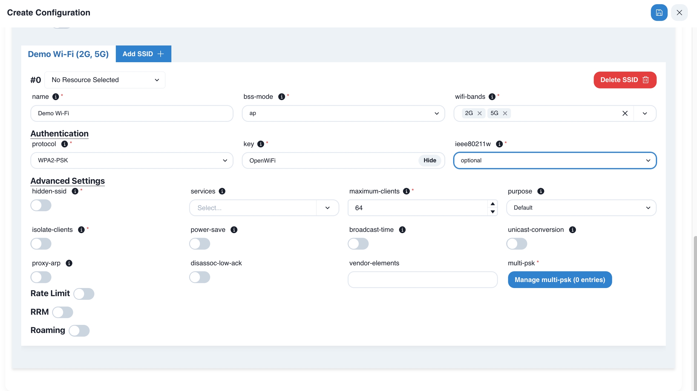 Most common SSID configuration parameters have been exposed via the Provisioning UI. Consult the OpenWiFi data model for the full list of available configurations.