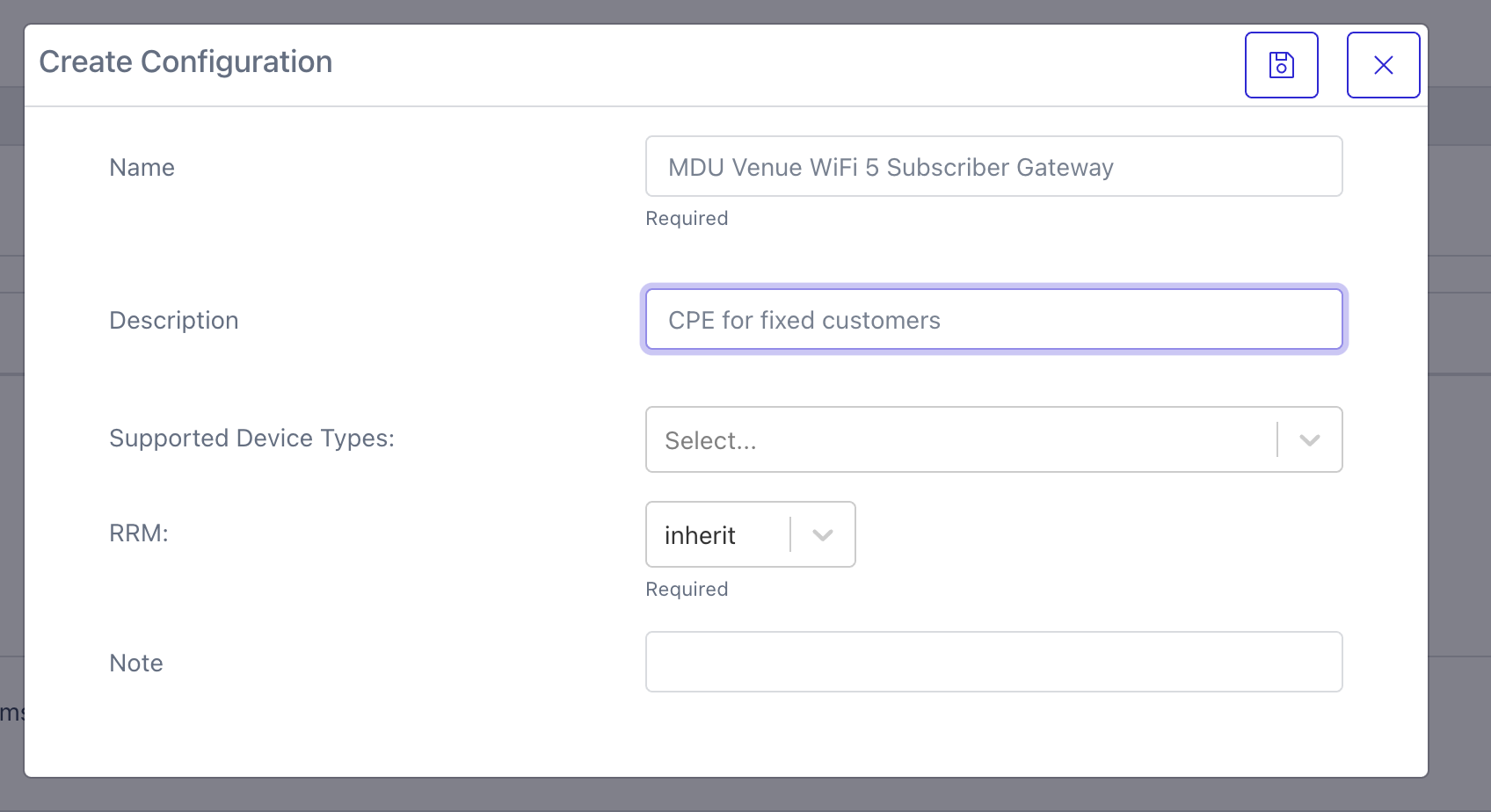 Use the Create Configuration window to create a configuration template for a specific venue or device.