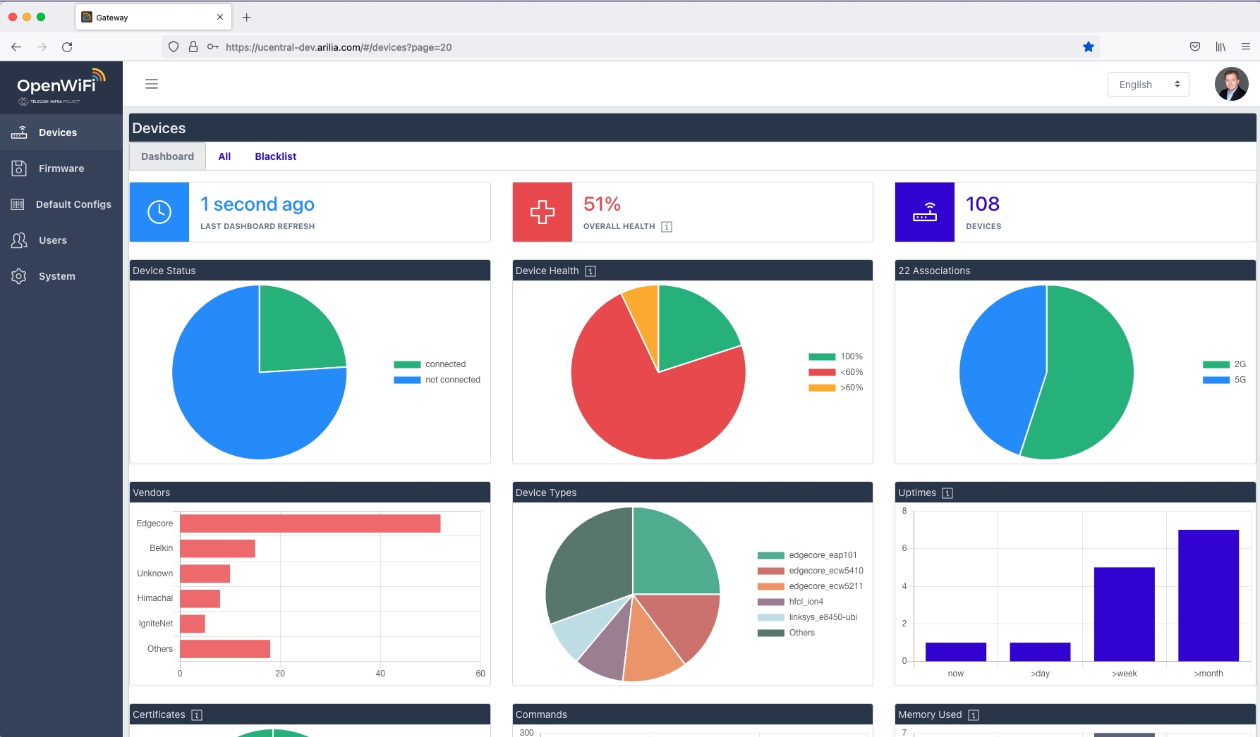 The OpenWiFi SDK provides a web UI for OpenWiFi administrators. The OpenWiFi UI shows all running services and configurations You can optionally show provisioning, management, and analytics for active deployed networks. All device interactions occur southbound using the OpenWiFi Gateway service. The Gateway implements the uCentral interface standard.