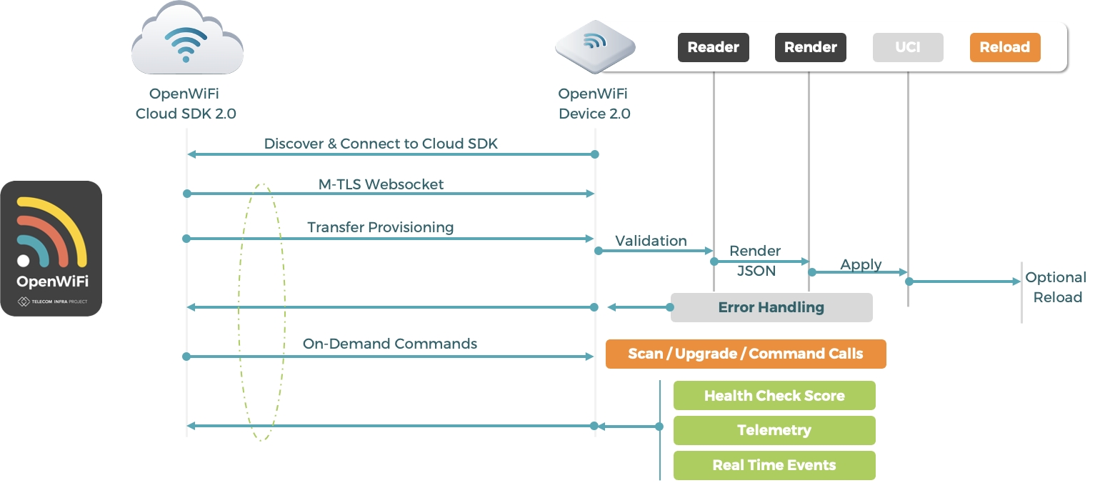 Given many cloud and ODM partners wish to consume the 2.x reference stack early, some with their own device provisioning logic as part of commercial cloud controllers, the following describes uCentral based management and telemetry, interactions with the OpenWiFi SDK processing provisioning and telemetry data.