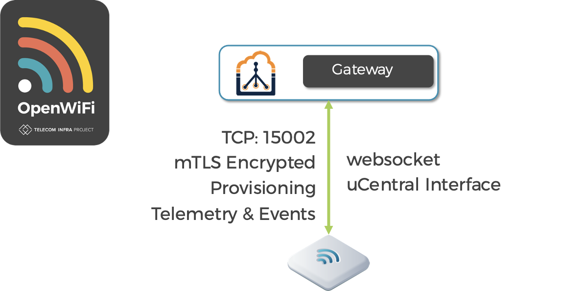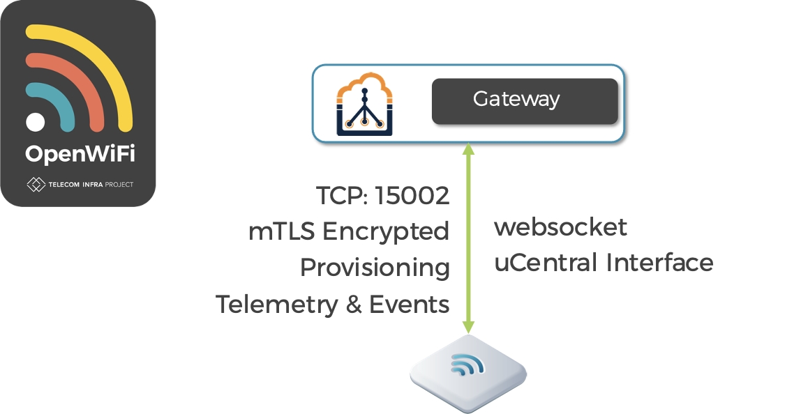 OpenWiFi 2.0 Gateway implements the uCentral device management interface. uCentral specifies the data model and interface for management and telemetry of OpenWrt based devices. Gateway uCentral interface is a websocket JSON-RPC based design between OpenWiFi Gateway and the device running uCentral agent.