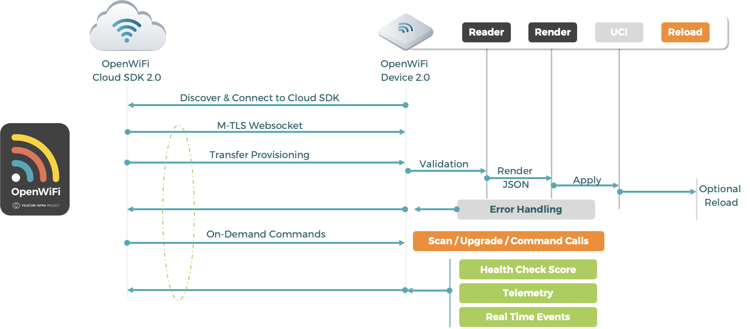 Upon successful connection the device exchanges its capabilities with the OpenWiFi SDK. OpenWIFi SDK, via the Gateway microservice will send the entire device provisioning data as a JSON payload. Within OpenWiFi devices, the uCentral agent has a reader and renderer process providing serialization and validation of data sent from cloud. If any data presented can not be processed by the local agent, this is returned within an ERROR message using the same websocket connection.