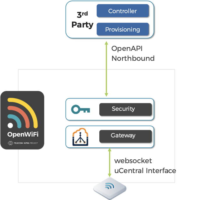 OpenWiFi 2.x makes it possible for integrators of the SDK to implement commercial products leveraging OpenWiFi Gateway service with vendor supplied provisioning above OpenWiFi SDK. As a minimum, the OpenWiFi 2.0 SDK framework offers a Security service which handles all OpenAPI authentication northbound, and the Gateway service which provides all uCentral websocket interface functionality southbound.