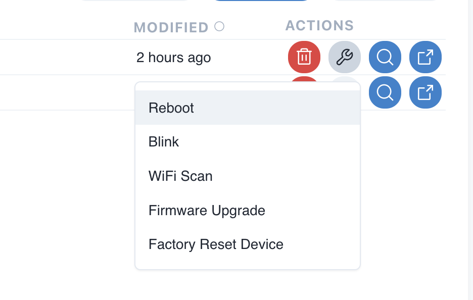 Inventory enables the admin to visually identify OpenWiFi devices not currently assigned to an Entity, Create a new device, execute commands per device, inspect device details and view the device active state as shown in the Gateway service.