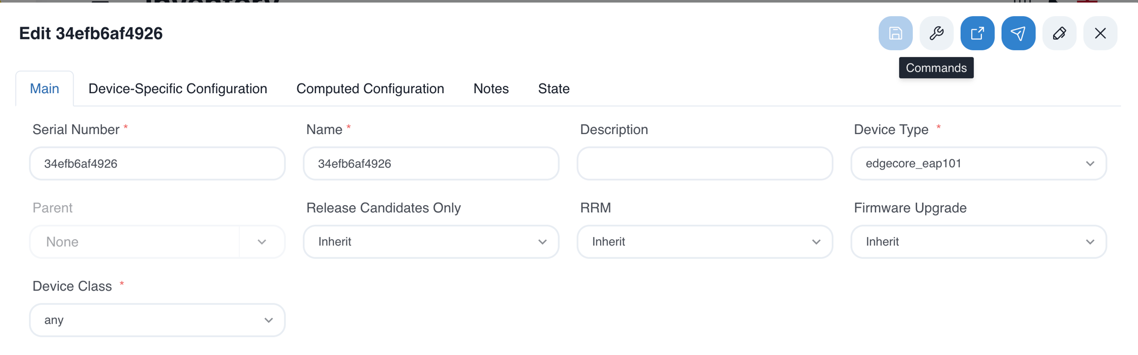 Within Device Details, found via the magnifying glass per Inventory row, association to an Entity Parent is possible. Additionally setting the device Firmware policy to inherit the rule assigned based on its membership to a Parent and to require Release Candidates or permit any nightly build upgrade to apply. Additionally the device may be enrolled within RRM should its Entity and Venue membership be part of RRM processing. Device Class determines if the device should be restricted to an Entity, Venue, and an end Subscriber.