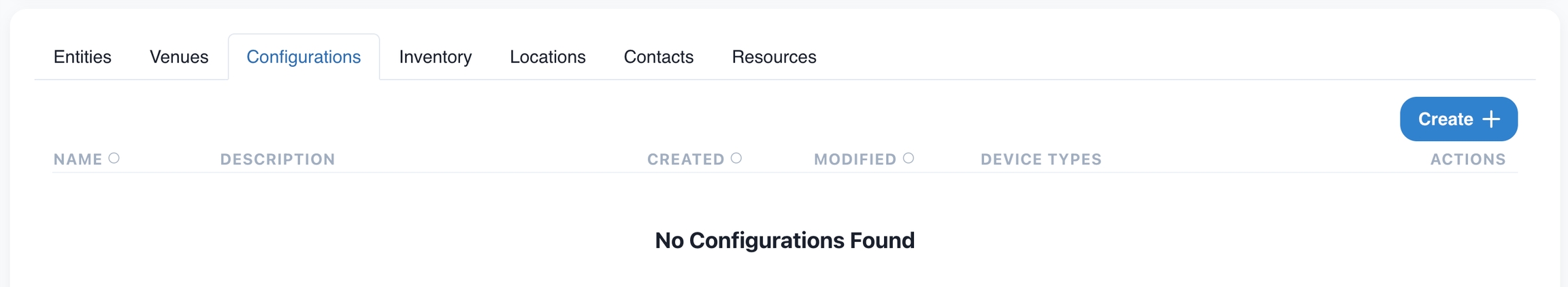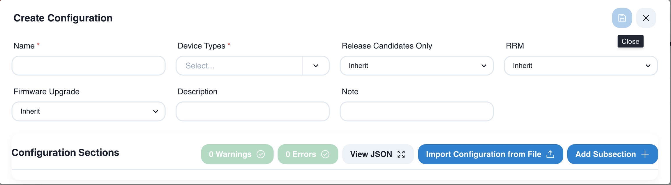 Create Configuration dialog requires a name and one or multiple device types to apply configuration with. If device inventory within an Entity or a Venue exist with no configuration templates matching Device Types of the associated inventory, no associated provisioning will apply to those devices. This is the basic logic that enables unique Wi-Fi device type configurations to be layered through the system.