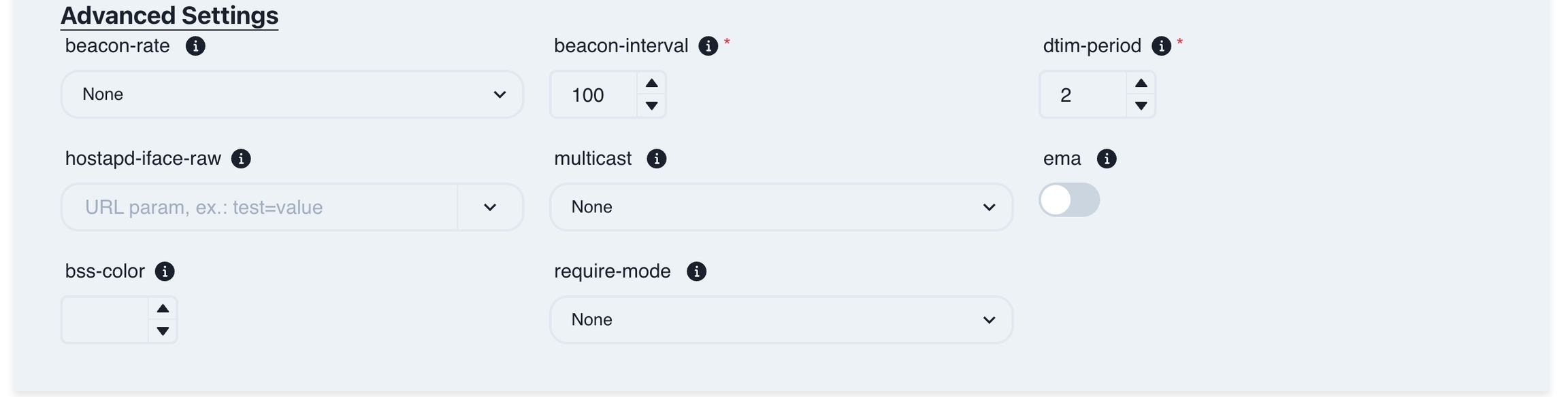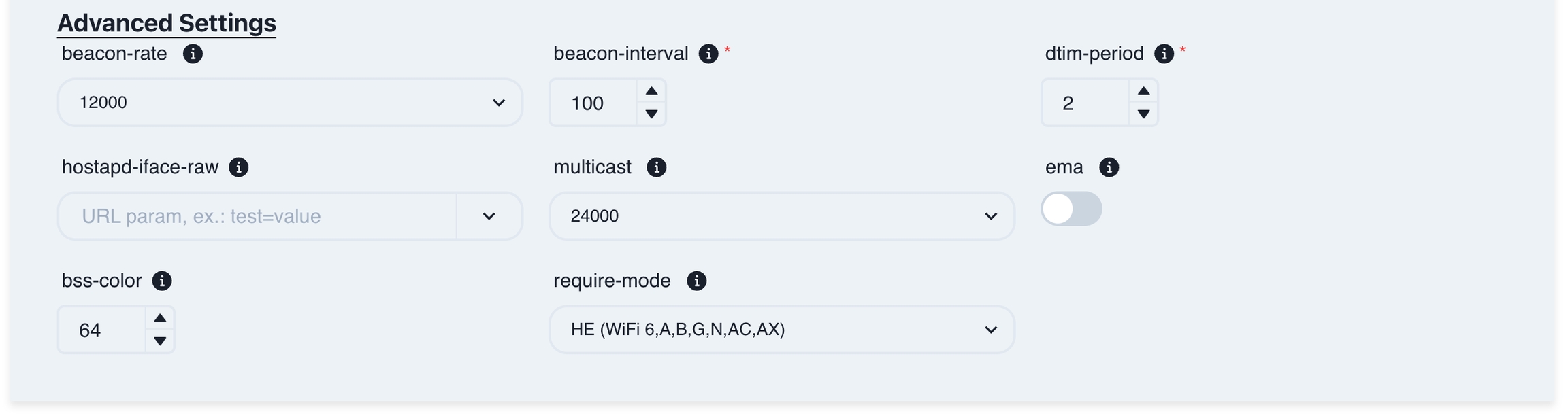 Setting specific configuration for the EAP 101 advanced radio parameters. For example, if a device in this entity is an EAP 101, it will have advanced radio properties of 12Mb/s beacon rate, 24Mb/s multicast rate, random BSS color and require HE mode.