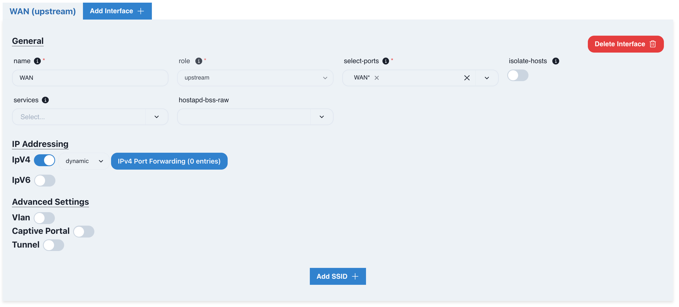 OpenWiFi has the concept of a virtual dataplane where the definition of the interface role as upstream or downstream defines if the port involved will be mapped to WAN or LAN operation.